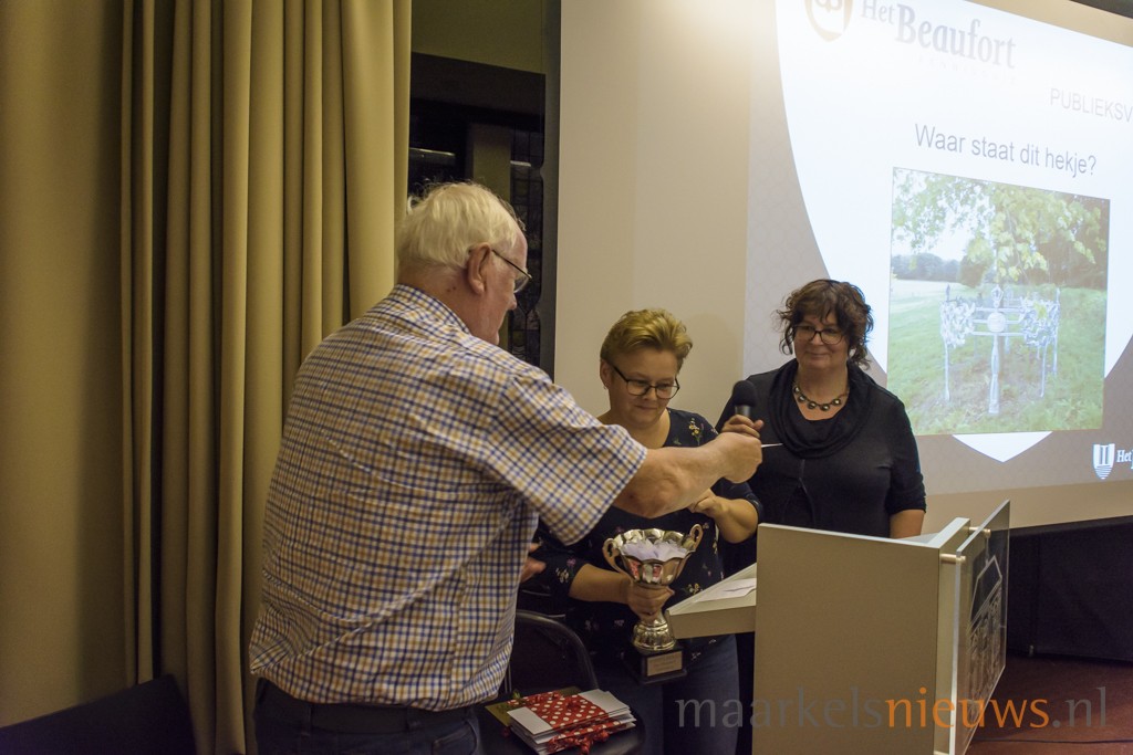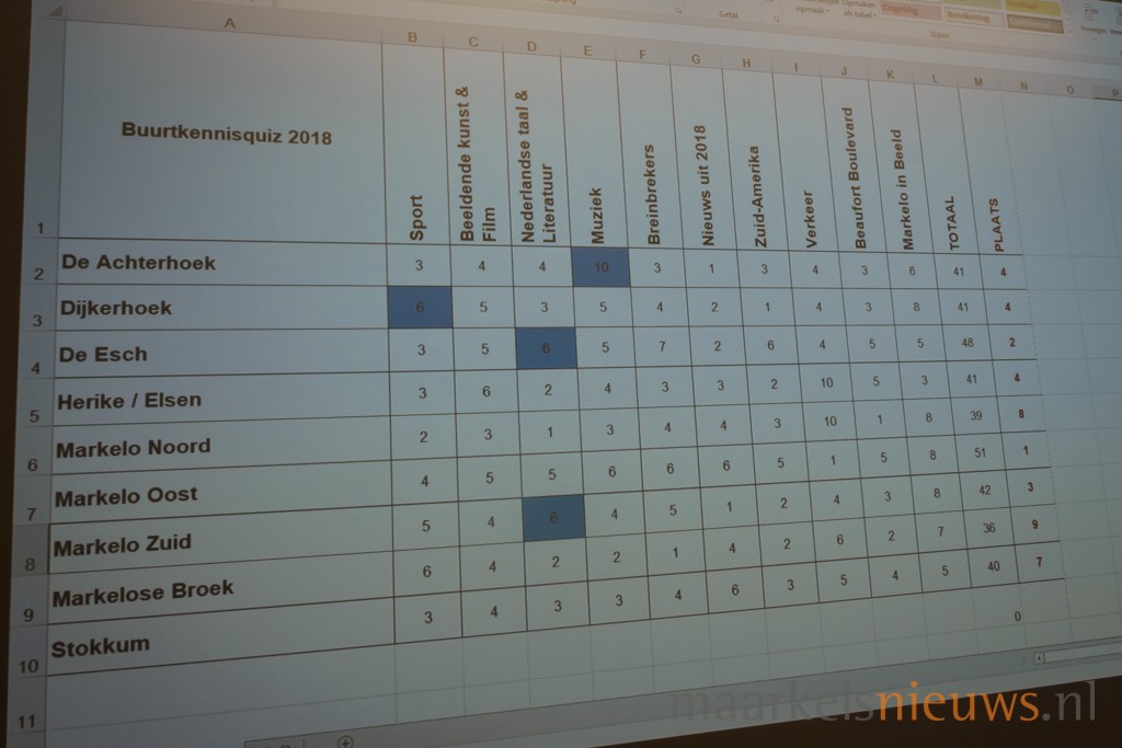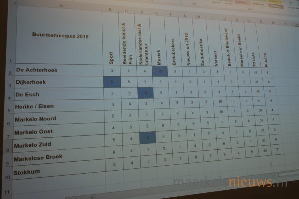In de voormalige raadszaal streden de Markelose buurten vanavond voor een plek in de Hofkennisquiz. De zaal in Het Beaufort was met 9 teams en publiek op de tribune goed gevuld. De teams kregen verdeeld over 10 categorieën 80 vragen, waarbij men een joker kon inzetten voor dubbele punten in 1 categorie. Men kon maximaal 88 punten halen. Presentator Henk Hondelink, die de Buurtkennisquiz al vaker presenteerde, gaf aan dat vooral de eerste vragen pittig waren. Ook het tweede deel werd door de teams niet als gemakkelijk ervaren. Uiteindelijk wist Markelo Oost met 51 punten de quiz te winnen en mag dat team op 1 februari 2019 de Markelose eer verdedigen in de Hofkennisquiz.