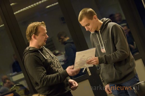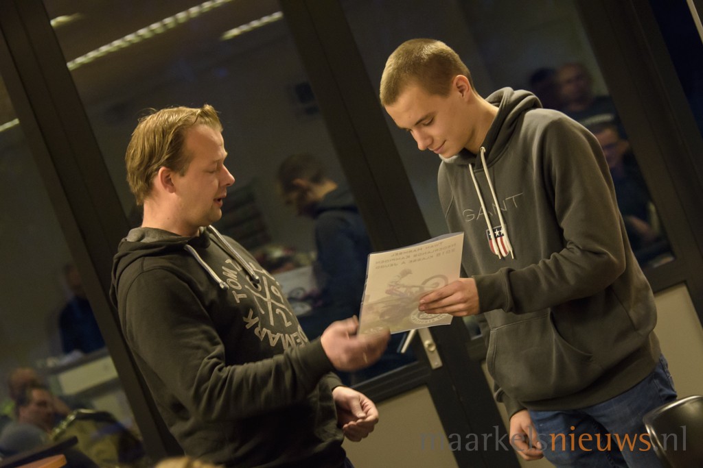 Voorzitter Eelco Laarman feliciteerde vanmiddag Twan Harmsel met zijn Nederlands kampioenschap trialmotorsport ten overstaande van de leden van Ons Genoegen. Tevens werden Rendo Boersma en Joep Lüth in het zonnetje gezet omdat zij vorige week in Chili een zware zes-daagse motorsportwedstrijd wisten uit te rijden. Alle drie werden met luid applaus beloond door de aanwezige leden.