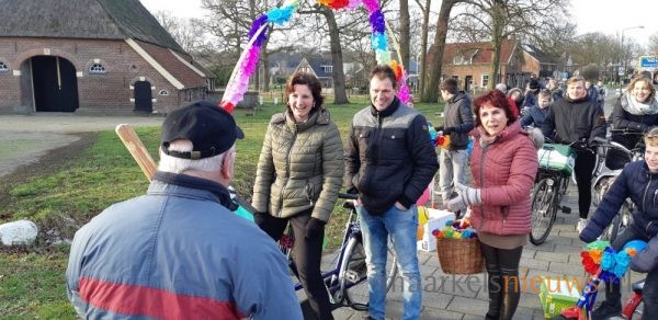 De familie Heuvel is gisteren op traditionele wijze naar hun nieuwe woning aan de Kerkweg gebracht. De oude buren ‘rondom de Middeler’ hebben Erwin, Miranda, Bram, Tom en Ties weggebracht. Erwin en Miranda gingen op pad met een versierde tandem en de jongens op stepjes vergezeld door de naaste buurvrouwen. Het geheel werd ter hoogte van boerderij ‘Koenderink’ staande gehouden waar de nieuwe buurt zich had verzameld. Hier was rekening mee gehouden en uit menig fietstas kwam een glas en fles tevoorschijn. Na de nodige borrels werd het (fiets)pad met originele riezebessum schoongeveegd en kon men vertrekken naar de Kerkweg 2, waar het nog lang gezellig bleef. Beide buurten wensen de familie Heuvel veel geluk op hun nieuwe stek.