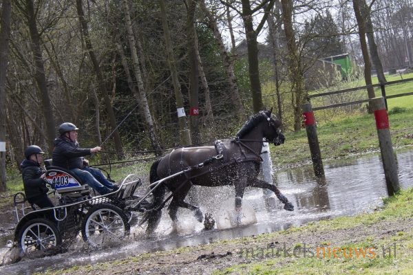 Op het buitenterrein van het Hippisch Centrum aan de Potdijk genoten liefhebbers van de mensport vanmorgen van de oefen-outdoorwedstrijd, die Menclub Markelo organiseerde voor leden en niet-leden van de vereniging. De oefen-outdoor werd gezien als een mooie start van het buitenseizoen voor de ervaren maar ook zeker voor de minder ervaren marathonrijders. De pony’s en paarden werden onder een lentezonnetje, behendig door het parcours gestuurd door de deelnemers. Het parcours bestond uit een vaardigheidsproef met daarin een aantal technische hindernissen verwerkt, die voor de deelnemers geen noemenswaardige problemen opleverden. “Het is een fijn parcours waar we een aantal fijne rondjes hebben kunnen rijden. Het is altijd goed georganiseerd in Markelo en fijn om hier te komen rijden”, geeft een van de enthousiaste deelnemers aan. Markeloër Peter Jager wist de eerste plek te behalen in de klasse ‘enkelspan pony’ en werd hierbij bijgestaan door zijn groom Bjarn Groenouwe. In de klasse ‘enkelspan paard’ werd de eerste plaats opgeëist door Jan Kelderman.