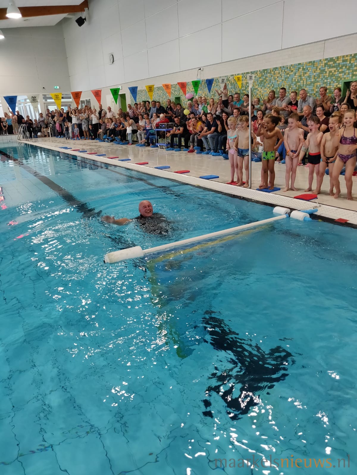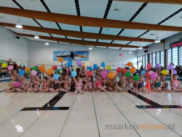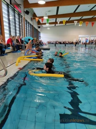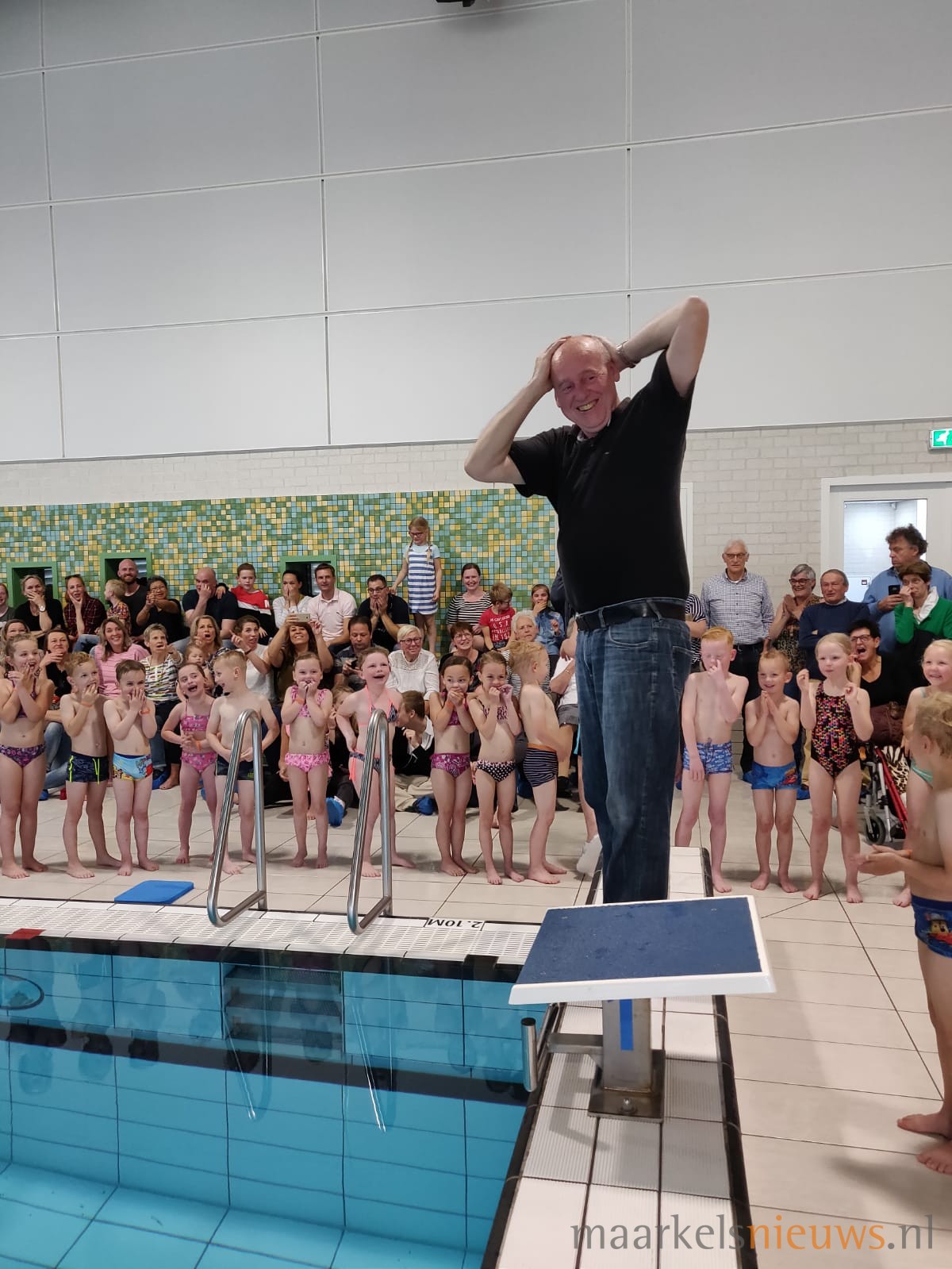 In zwembad De Vijf Heuvels behaalden gisteren 46 kinderen zwemdiploma A, gingen er 38 kinderen met succes op voor zwemdiploma B en wisten er 9 kinderen zwemdiploma C te behalen. Er werd dan ook een feestje gevierd in het zwembad. Voor Isabel ten Donkelaar was het dubbel feest, ze was gisteren 5 jaar geworden. De hele zwemzaal zong voor haar ‘Land zal ze leven’ en haar opa Geert Warris wilde als klap op de vuurpijl wel met kleren aan door het gat zwemmen. Hij kreeg bij bovenkomst applaus uit de zaal.