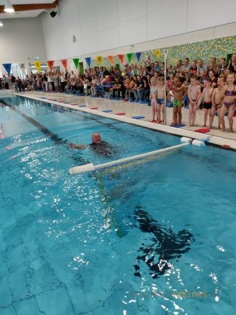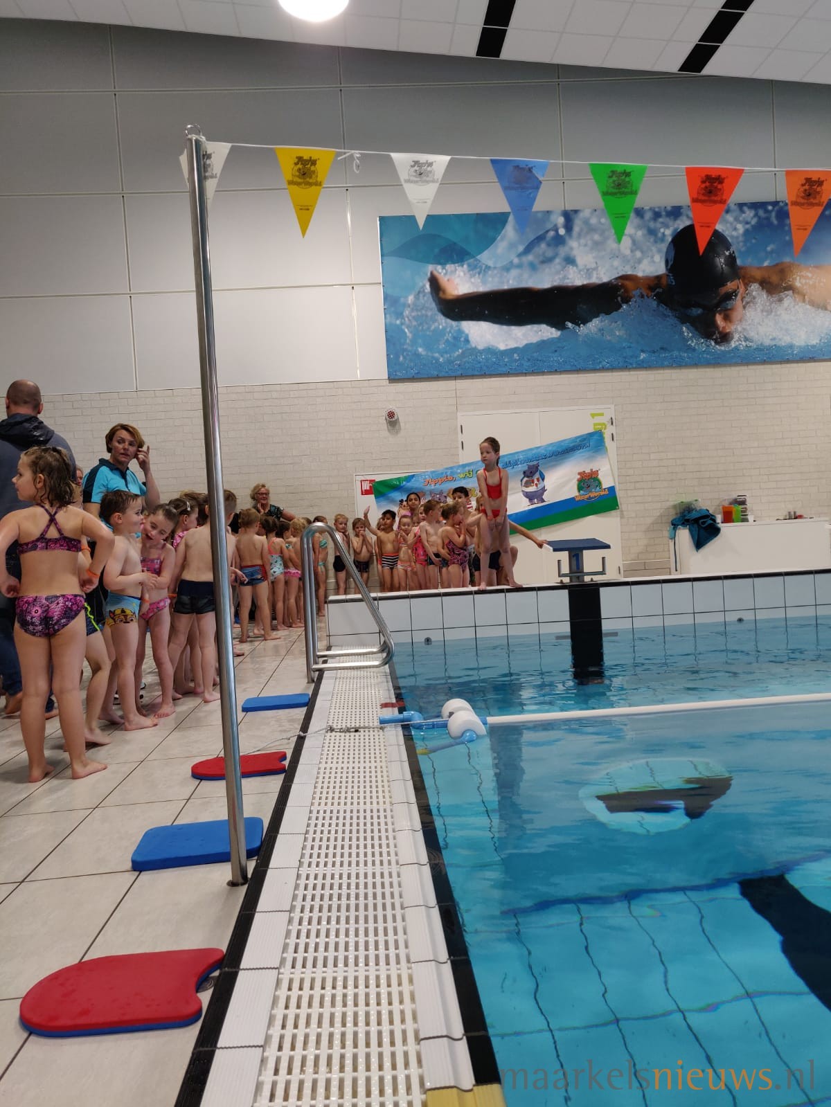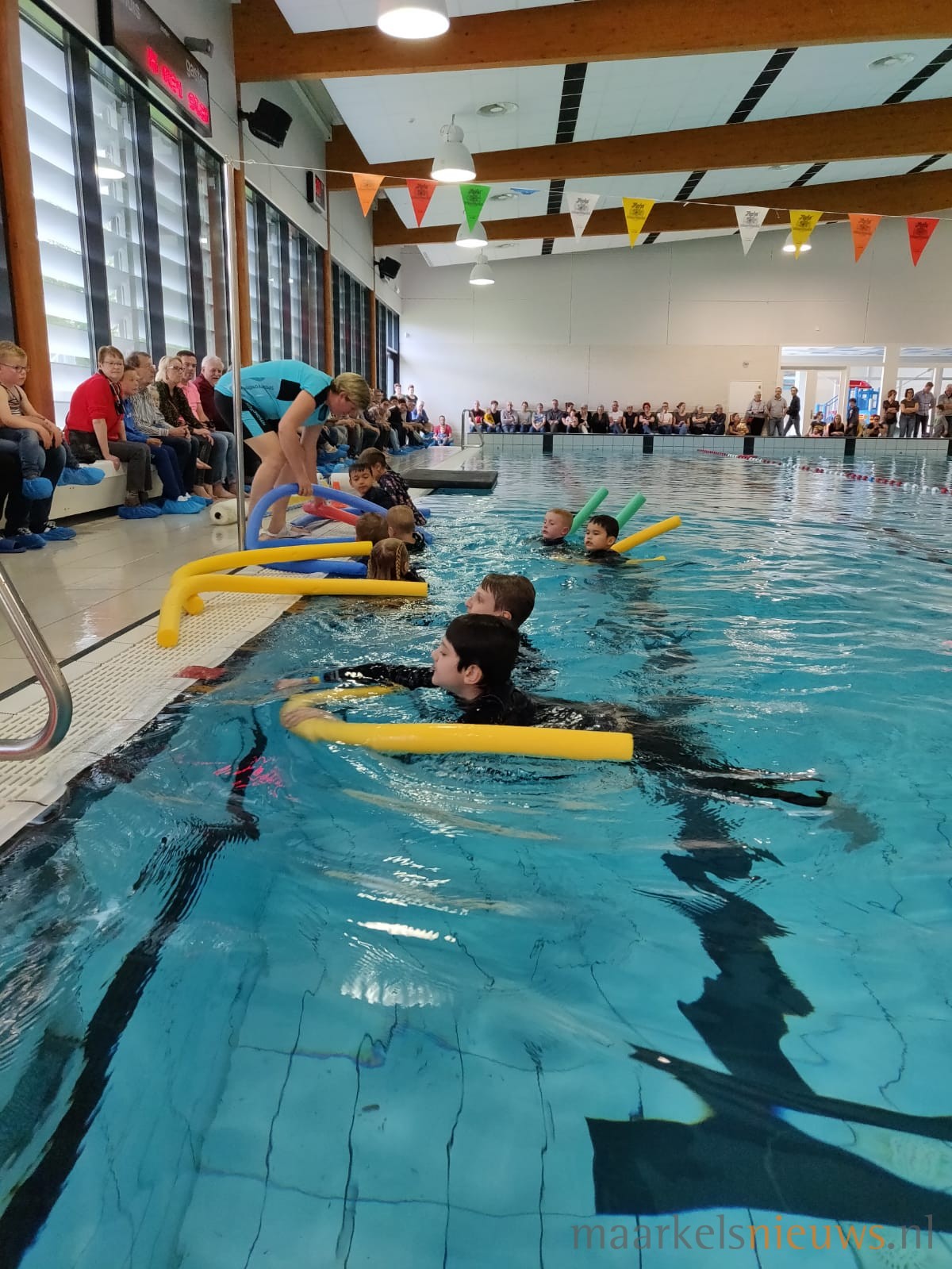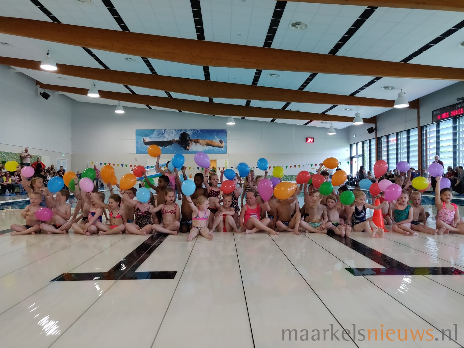 In zwembad De Vijf Heuvels behaalden gisteren 46 kinderen zwemdiploma A, gingen er 38 kinderen met succes op voor zwemdiploma B en wisten er 9 kinderen zwemdiploma C te behalen. Er werd dan ook een feestje gevierd in het zwembad. Voor Isabel ten Donkelaar was het dubbel feest, ze was gisteren 5 jaar geworden. De hele zwemzaal zong voor haar ‘Land zal ze leven’ en haar opa Geert Warris wilde als klap op de vuurpijl wel met kleren aan door het gat zwemmen. Hij kreeg bij bovenkomst applaus uit de zaal.