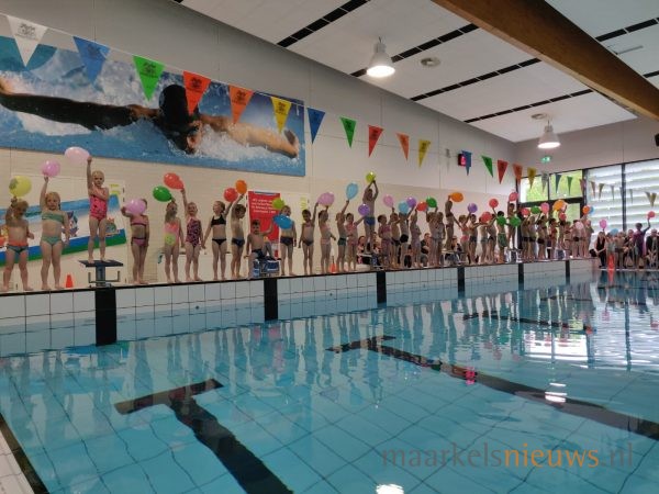 In zwembad De Vijf Heuvels behaalden gisteren 46 kinderen zwemdiploma A, gingen er 38 kinderen met succes op voor zwemdiploma B en wisten er 9 kinderen zwemdiploma C te behalen. Er werd dan ook een feestje gevierd in het zwembad. Voor Isabel ten Donkelaar was het dubbel feest, ze was gisteren 5 jaar geworden. De hele zwemzaal zong voor haar ‘Land zal ze leven’ en haar opa Geert Warris wilde als klap op de vuurpijl wel met kleren aan door het gat zwemmen. Hij kreeg bij bovenkomst applaus uit de zaal.