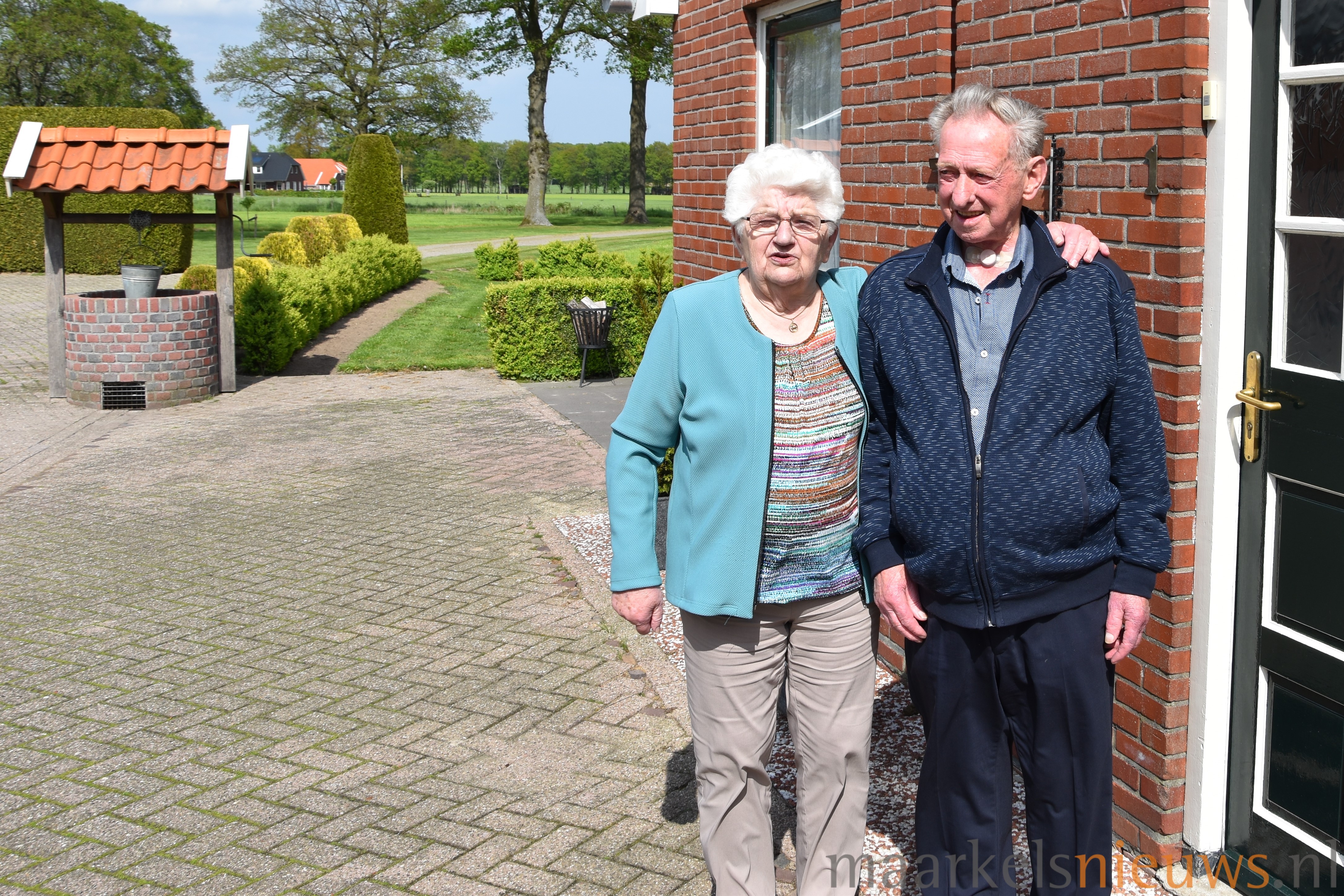 Riek (86) en Hendrik (84) Smit-Knopers vierden op 9 mei 2019 hun diamanten huwelijksjubileum. Burgemeester Ellen Nauta bracht het diamanten bruidspaar gistermiddag een bezoek in hun boerderij aan de Winterkamperweg in Markelo om hen met dit bijzonder jubileum namens de gemeente Hof van Twente te feliciteren. Zowel Riek als Hendrik zijn geboren en getogen in Markelo. Riek woonde vlakbij de TV-toren. Beiden hebben ze nooit Markelo verlaten. Nadat ze elkaar leerden kennen bij de Zon in Goor, trouwden ze en namen hun intrek op de boerderij bij Hendrik’s ouders.Hendrik is van beroep altijd slager geweest, Riek heeft thuis moeten helpen met onder andere de koeien, kippen, paarden en varkens. Ze hadden op de boerderij vleeskoeien, de zogenaamde Blonde Aquitainers. Deze liepen met de kalfjes in de wei. Riek en Hendrik runnen samen het huishouden, Riek voornamelijk binnen en Hendrik en hun zoon Gerrit doen alles wat er buiten moet gebeuren.