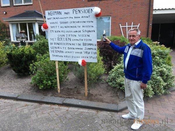 Herman Schreurs werd deze week door zijn naaste buren aan de Taets van Amerongenstraat verrast. De naaste buren plaatsten een bord met passende tekst om hem van harte te feliciteren met zijn pensioen. Herman gaat namelijk na 45 jaar werkzaam te zijn geweest, genieten van zijn vrije tijd. Jarenlang werkte Herman bij Coberco in Markelo. De laatste jaren was Herman in dienst van Gildebor. Herman: namens de buren nogmaals van harte gefeliciteerd met je pensioen en nu lekker gaan genieten!