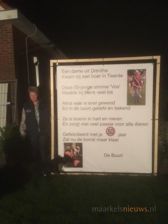 Alina Udink viert vandaag haar 50e verjaardag. Voor de buurt natuurlijk meer dan voldoende reden om haar tuin aan de Brummelaarsweg eens wat op te sieren. Het was gisteravond dan ook al snel erg gezellig op het erf van de familie Udink. Na het keuren van de Sarah en het bijpassende spandoek werd al snel het glas geheven en was het nog lange tijd onrustig rond de boerderij. Alina; namens de buurt nogmaals van harte gefeliciteerd met deze bijzondere verjaardag!