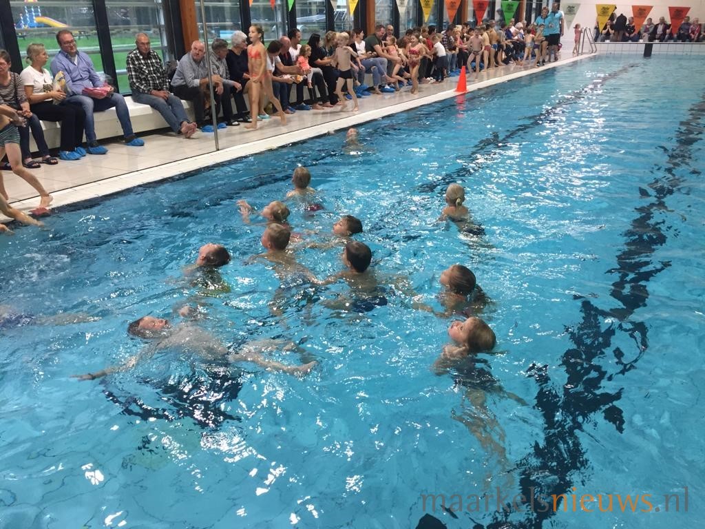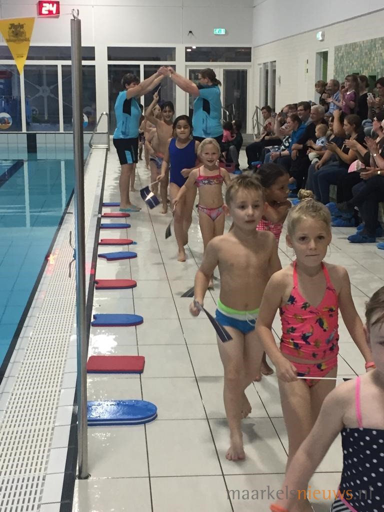 Het was gezellig druk in en rond het binnenbad van Sportfondsenbad De Vijf Heuvels waar vanmiddag weer drie nieuwe groepen klaar stonden om te laten zien wat zij in de afgelopen weken allemaal hadden geleerd. Onder het toeziend oog van ouders, opa’s, oma’s, broertjes, zusjes en andere belangstellenden sprongen de kinderen in het diepe om hun uiterste best te doen voor het behalen van een zwemdiploma A, B of C. De kinderen hebben stuk voor stuk laten zien dat ze de kunst van het zwemmen beheersen. In totaal zwommen vandaag 69 kinderen af waarvan 24 kinderen na afloop hun zwemdiploma A, uitgereikt kregen door het enthousiaste zwembadpersoneel. Zwemdiploma B en C werd respectievelijk aan 33 en 12 kinderen uitgereikt. Zoals altijd wisten het badpersoneel er ook nu weer een feestelijke gebeurtenis van te maken voor de kinderen en zij willen de kinderen dan ook graag nogmaals van harte feliciteren met hun behaalde zwemdiploma’s.
