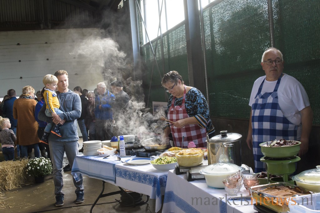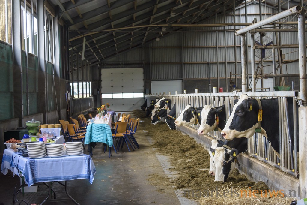 Ondertussen waren de vrijwilligers van het ‘Eetbaar Erf’ een lunch tussen de koeien aan het voorbereiden waarbij voornamelijk producten van eigen erf werden gebruikt. Met vooraf soep, die op traditionele wijze werd warm gehouden in de hooikist genoten de deelnemers daarna van onder andere wentelteefjes, broodtaart, aardappelpuree met reeragout, salade, stoofpeertjes en aardappeltortilla. Een geweldige morgen waar de deelnemers een betere kijk kregen van het reilen en zeilen binnen het boerenbedrijf en hierin oprecht geïnteresseerd bleken. De vele vragen werden uitgebreid beantwoord waarbij de liefde voor het vak en de dieren duidelijk naar voren kwam.