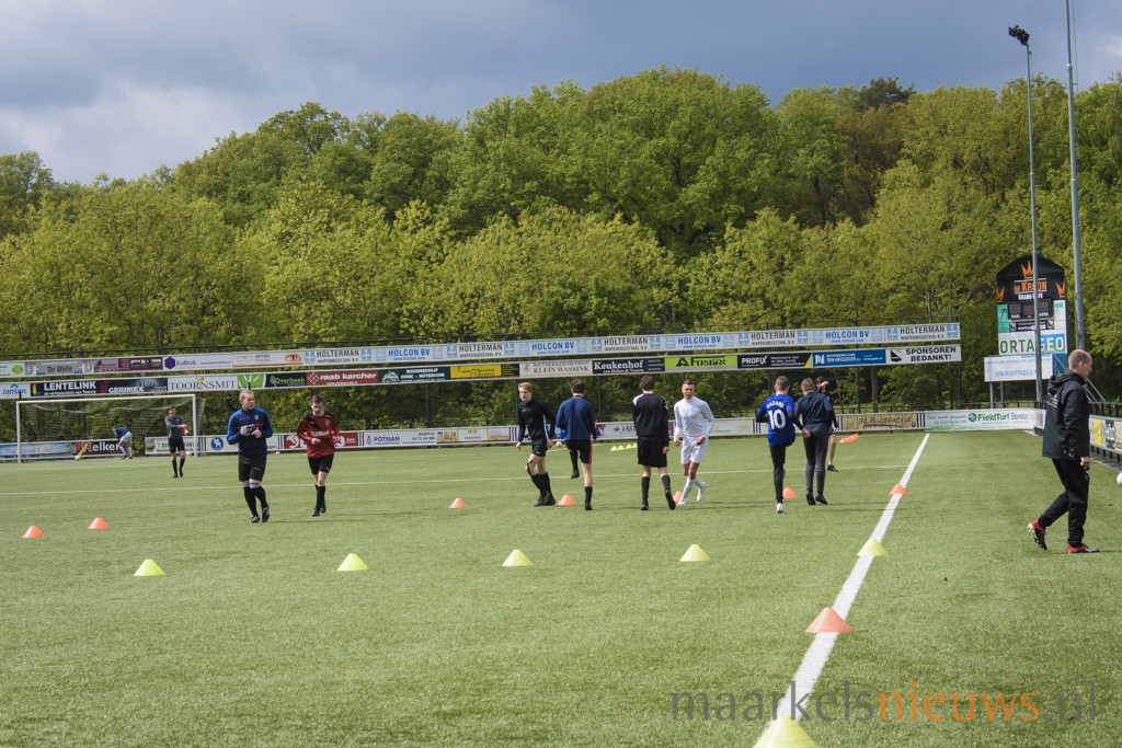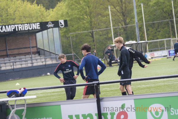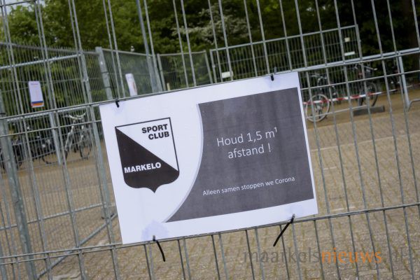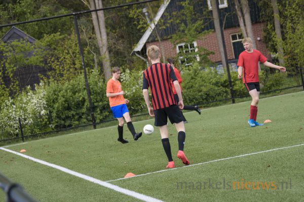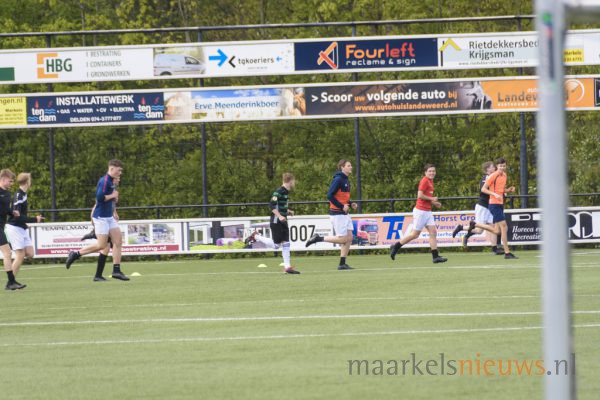 Wie zich vanmiddag in de buurt van het Sportpark aan de Endemansdijk in Markelo ophield, heeft vanmiddag ongetwijfeld het mooie schouwspel gezien dat zich op de voetbalvelden voltrok. “Een prachtig gezicht inderdaad om te zien dat onze velden na ruim 6 weken weer bespeeld worden. Ik ben enorm blij dat we het binnen onze club, met elkaar in korte tijd hebben kunnen regelen dat de jeugdleden vandaag weer voor het eerst op te velden kunnen trainen”, vertelt voorzitter Jelle Renes niet zonder trots. Vanaf 16 maart was het sportcompex door de aanvullende maatregelen in de aanpak van de coronavirus gesloten. Mits een goed plan van aanpak is het sinds deze week mogelijk voor de jeugd om de sport weer te hervatten. Jelle schreef zelf het plan van aanpak van Sportclub Markelo dat moest worden ingediend bij de gemeente, maar benadrukt dat er met elkaar de schouders onder is gezet en de verschillende onderdelen met elkaar zijn opgepakt en tot in detail zijn uitgewerkt. Het resultaat mag er zijn, aan alles is gedacht en het verloopt allemaal soepel. De regenbuien worden getrotseerd en neemt de jeugd voor lief. “Het is fijn om weer hier te zijn en een balletje te trappen op het veld”, vertelt een jeugdlid die net natgeregend van het veld af komt.