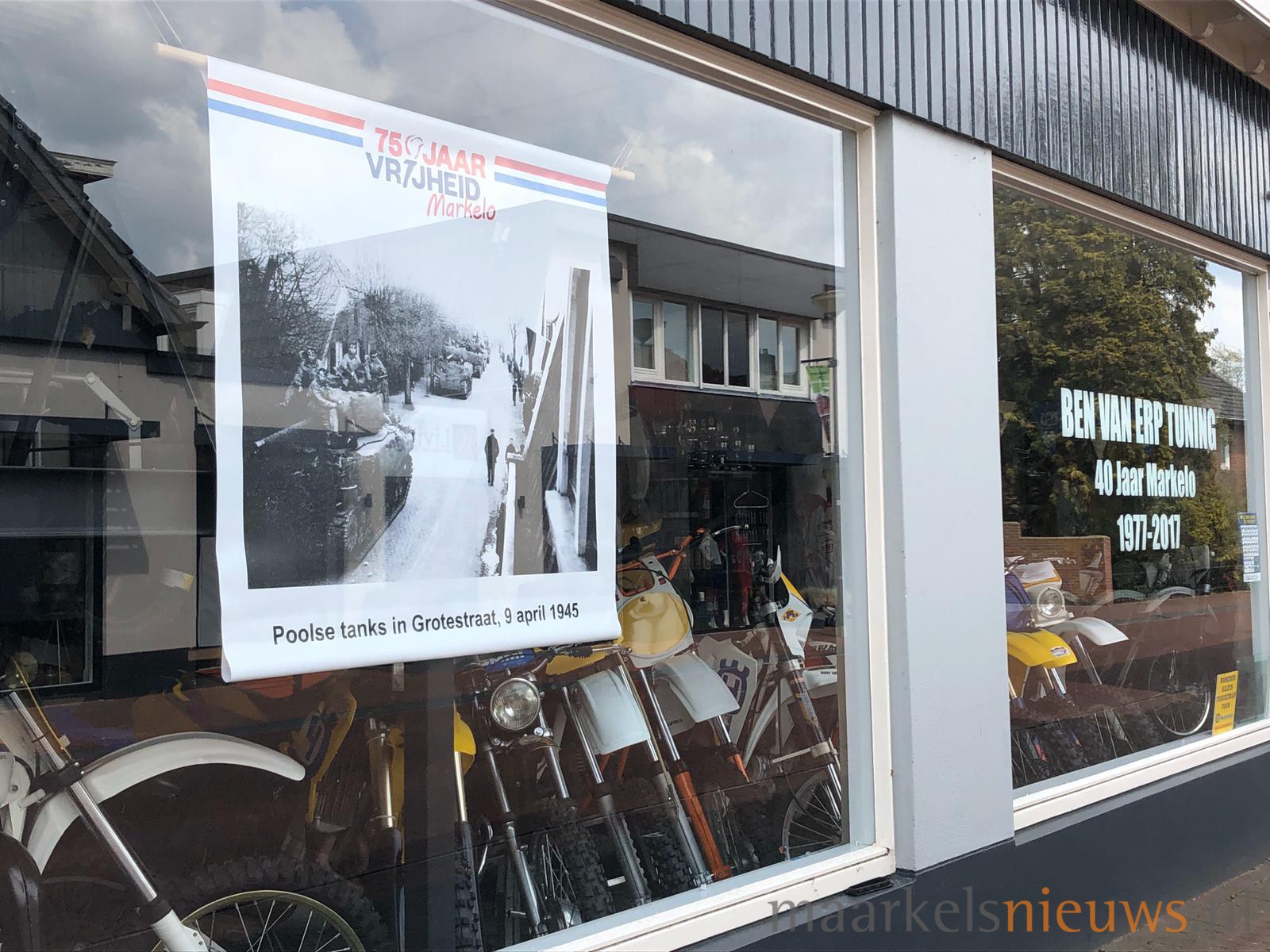 Aan de muur van de paardenstal van de familie Hargeerds aan de Grotestraat is een poster opgehangen van een Poolse tank. Dit was de eerste tank die op 9 april in Markelo verscheen. In de etalage van Ben van Erp zijn ook Poolse tanks te bekijken. Deze tanks kwamen op 9 april van Goor en gingen via Markelo naar Rijssen omdat bij Goor de brug over de Regge vernield was. Aan het balkon van het appartement van Jannie Dollekamp in het Appartementencomplex de Swaen aan de Grotestraat hangt een poster van de eerste Canadese jeep bij Smid Dollekamp. Dit was de eerste geallieerde jeep met Major C.F.L. Roy en Captain J. Hamilton van het Canadese Regiment Fuseliers Mont-Royal, die daarmee op 8 april om circa 13.30 uur Markelo hebben bevrijd. Voor de tijdelijke schoollocatie van Obs de Zwaluw is in een spanraam een afbeelding van Hotel Lichtendahl te bekijken. Hotel Lichtendahl werd door de Duitsers gevorderd en werd bekend als het hotel met meisjes van plezier voor Duitse officieren. Tussen de bomen op het Burgemeester de Beaufortplein hangt een poster van de oude Dorpsschool. De Oude Dorpsschool werd ook gevorderd en ingericht als kazerne voor Duitse soldaten.