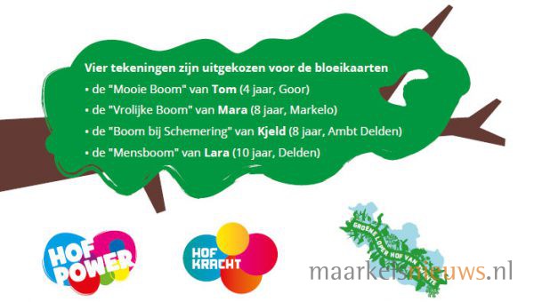 De ‘Vrolijke Boom’ van de 8-jarige Mara Dollekamp uit Markelo is een van de 4 winnende tekeningen in de tekenwedstrijd van dit jaar van HofPower. De tekening wordt evenals 3 andere winnende tekeningen van kinderen die mee hebben gedaan aan de wedstrijd rond 22 mei, de Dag van de Biodiversiteit, bezorgd als bloeikaart op 1.000 adressen aan de invalswegen van Markelo en andere kernen van Hof van Twente. Een bloeikaart is een kaart met bloemzaadjes erin verwerkt. De actie is een een initiatief van de Groene Loper Hof van Twente, Hofkracht en HofPower.
