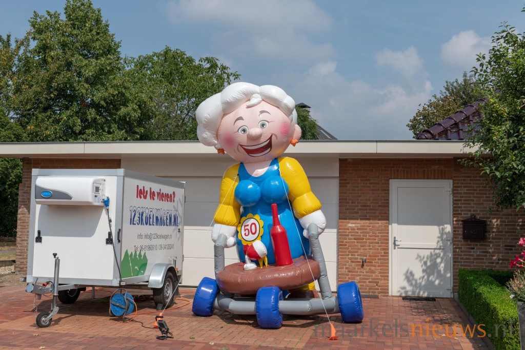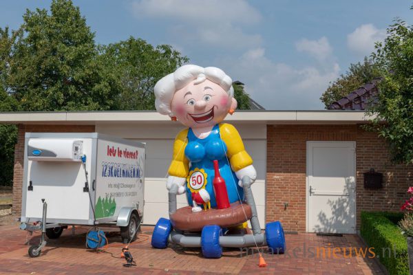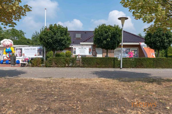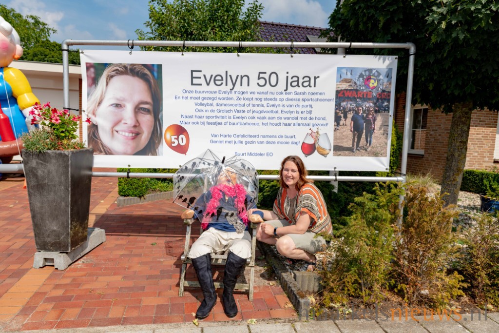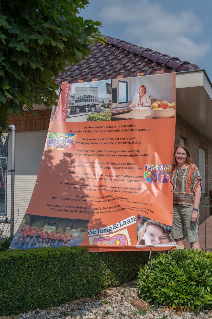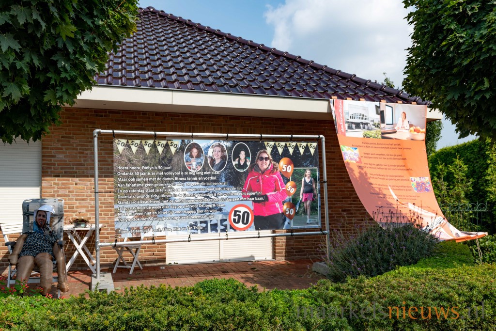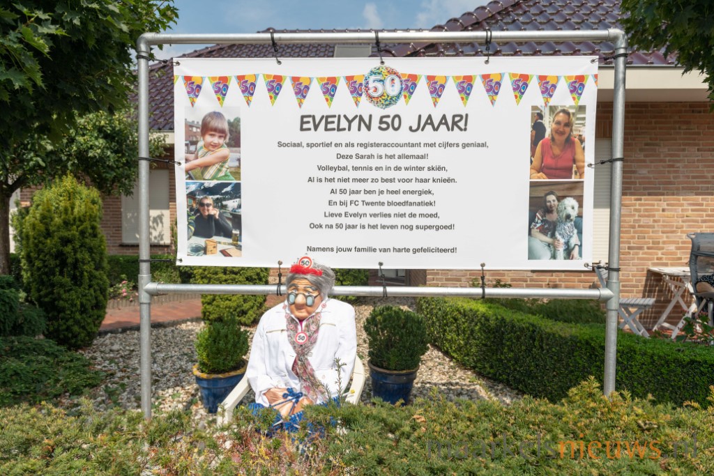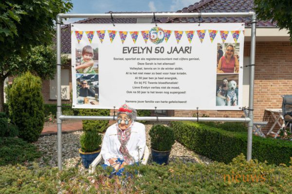 Vandaag viert Evelyn Haandrikman haar vijftigste verjaardag. Ondanks dreigend onweer en de eerste druppels regen is gisteravond door familie, vrienden, collega’s en de buren de tuin versierd met spandoeken en meerdere Sarah’s. Evelyn, namens alle aanwezigen nogmaals van harte gefeliciteerd met je verjaardag!