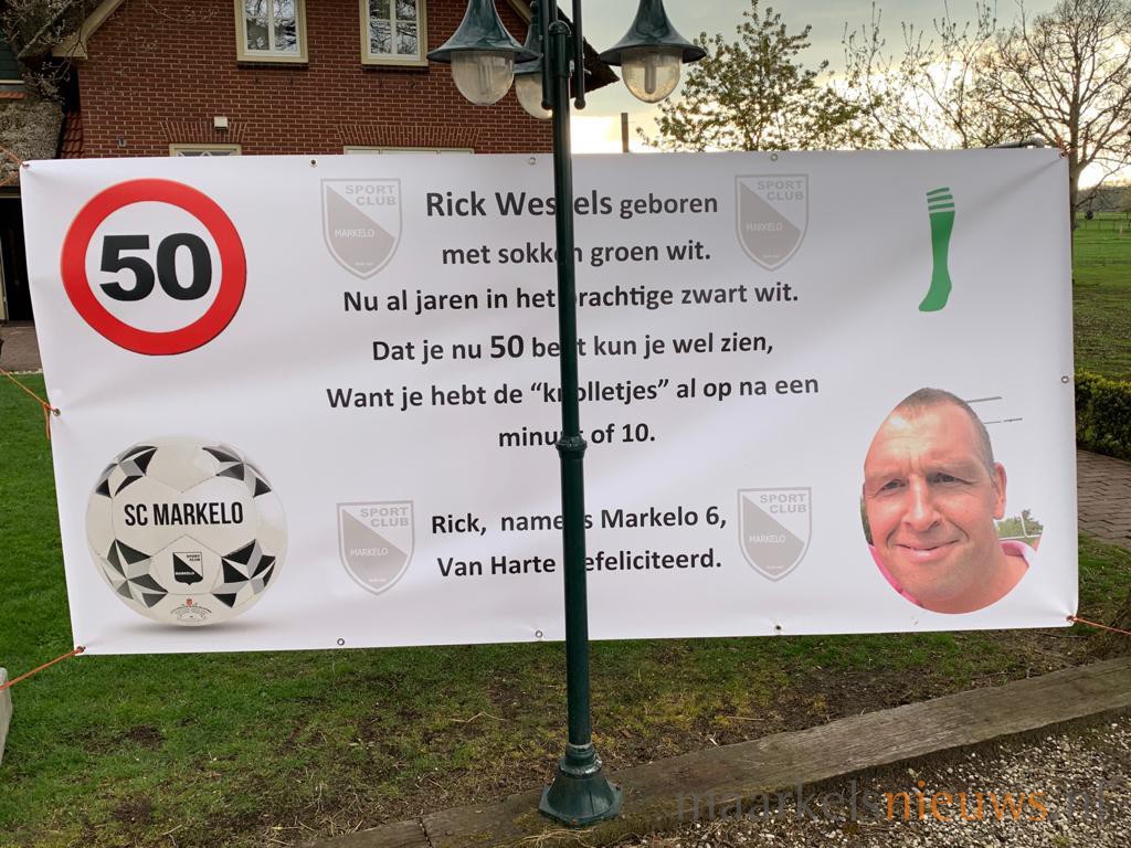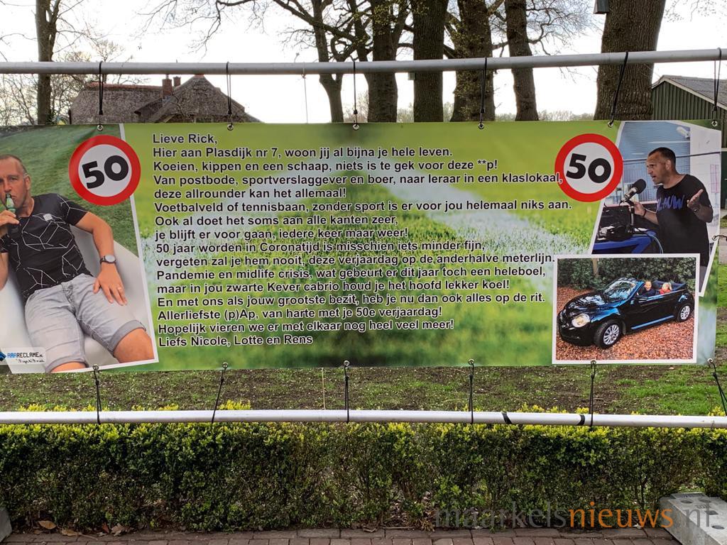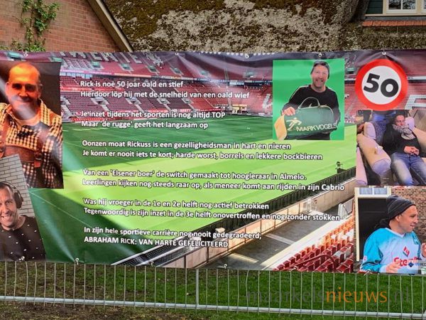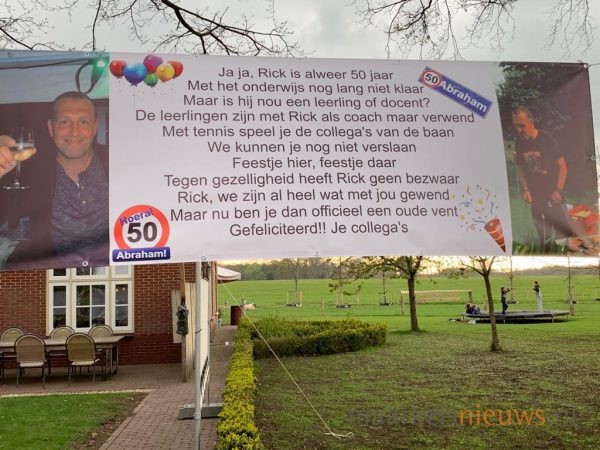 Verspreid over de dag was het gisteren een komen en gaan aan de Plasdijk in Elsen. Familie, vrienden, buren, voetbalvrienden, tennisvrienden en collega’s versierden de tuin van Rick Wessels met Abrahams en spandoeken. Uiteraard in corona stijl is het Abraham zetten, toch nog een leuke festiviteit geworden voor Rick die vandaag zijn 50e verjaardag viert. Rick; namens familie, vrienden, tennisvrienden, Markelo 6, buren en collega’s nogmaals van harte gefeliciteerd met je 50e verjaardag!